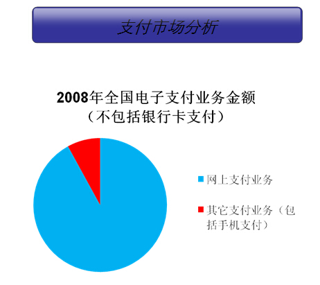 电子支付业务客户数量快速增长,交易额不断扩大,2008年全年,全国电子支付业务达到30.75亿笔,金额286.3万亿元。其中网上支付业务26.06亿笔,金额263.64万亿元;第三方手机支付交易达143.96亿元。(易观国际统计数据);